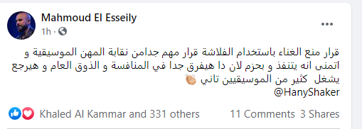 نشر العسيلي، على حسابه الشخصي بموقع التواصل الاجتماعي فيس بوك: «قرار منع الغناء باستخدام الفلاشة، قرار مهم جدا من نقابة المهن الموسيقية وأتمنى أنه يتنفذ وبحزم لأن دا هيفرق جدا في المنافسة والذوق العام وهيرجع يشغل كثير من الموسيقيين تاني».