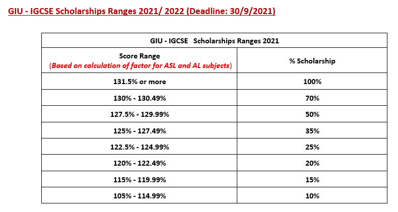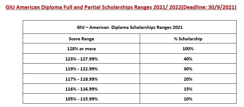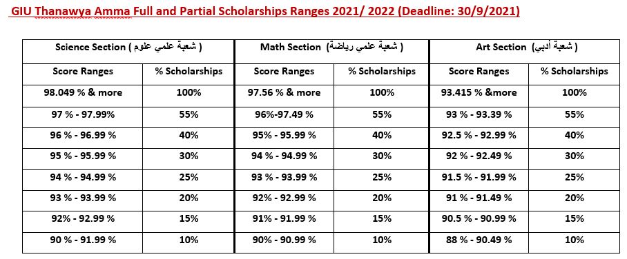 تقدم GIU منحًا دراسية كاملة سنويًا لحاملي Al Thanaweya Al-Amma الوطنيين الأعلى تصنيفًا للدراسة في أحد تخصصات GIU المختلفة على مر السنين، استفاد مئات الطلاب من هذا النوع من المنح الدراسية.