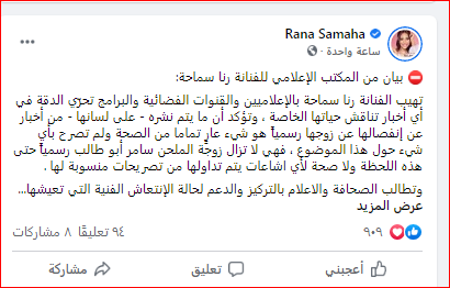جاء البيان الذي نشرته رنا سماحة عبر صفحتها الرسمية بموقع فيس بوك: «تهيب الفنانة رنا سماحة بالإعلاميين والقنوات الفضائية والبرامج تحرّي الدقة في أي أخبار تناقش حياتها الخاصة، وتؤكد أن ما يتم نشره على لسانها من أخبار عن انفصالها عن زوجها رسميًا هو شيء عارٍ تمامًا من الصحة ولم تصرح بأي شيء حول هذا الموضوع، فهي لا تزال زوجة الملحن سامر أبو طالب رسميًا حتى هذه اللحظة ولا صحة لأي إشاعات يتم تداولها من تصريحات منسوبة لها».