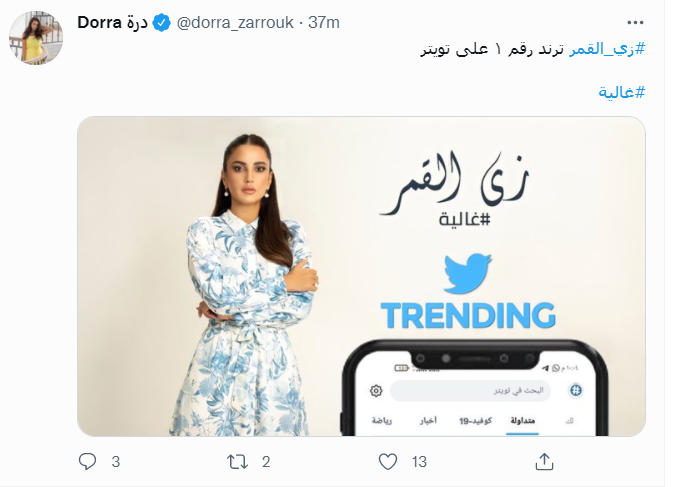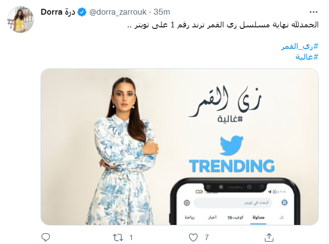 كما نشرت درة الصورة مرة أخرى على حسابها الخاص عبر تويتر، تعبيرا عن سعادتها بنجاح المسلسل، وعلقت عليها قائلة: زي القمر تريند رقم 1 على تويتر.