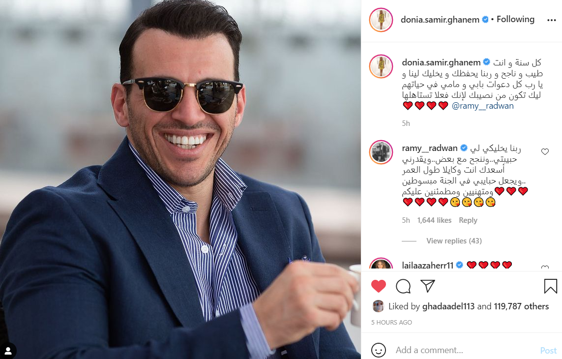 ونشرت دنيا، صورة لزوجها رامي عبر حسابها الرسمي على موقع إنستجرام، وعلقت عليها قائلة: كل سنة وإنت طيب وناجح.. وربنا يحفظك ويخليك لينا.. ويارب دعوات بابي ومامي في حياتهم ليك تكون من نصيبك لإنك فعلًا تستاهلها.