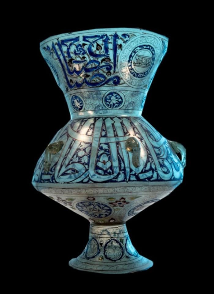 1- مشكاة من العصر المملوكي، زخرف كل من بدن المشكاة ورقبتها بكتابه بخط الثلث المملوكي منها جزء من الآية القرآنية " الله نور السموات والأرض" بالإضافة إلي اسم والقاب السلطان حسن، وكانت المشكاة من أهم وسائل الإضاءة في العصر المملوكي.