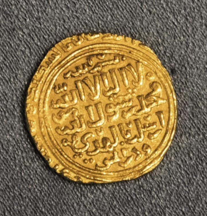 2- دينار من العصر المملوكي علي احد وجهيه اسم السلطان المملوكي بيبرس ويوجد من أسفل شكل" السبع "والذي يمثل الرنك أو الشعار الشخصي لهذا السلطان وعلي الوجه الاخر توجد كتابه.