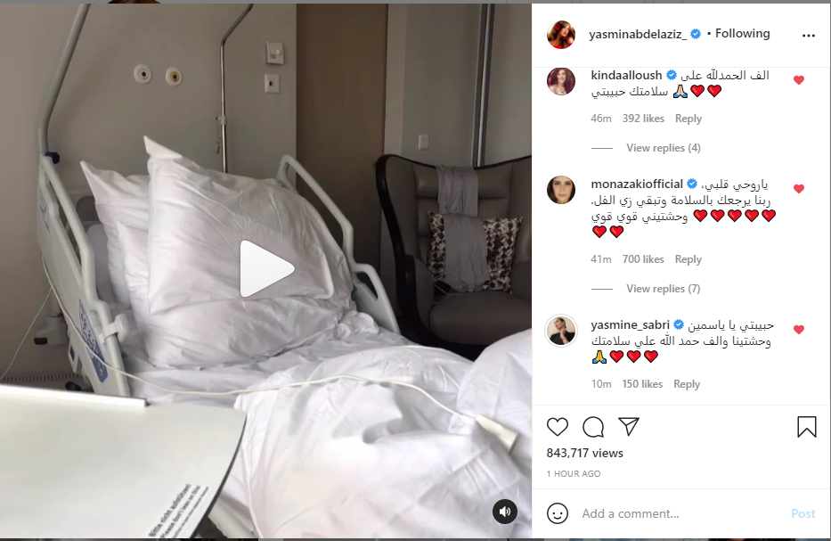 كما انهالت التعليقات من نجوم الفن على منشور ياسمين عبد العزيز داعين لها بتمام شفائها، حيث كتبت لها الفنانة كندة علوش: «ألف الحمدلله على سلامتك حبيبتي»، وكتبت لها منى زكي: «ياروحي قلبي، ربنا يرجعك بالسلامة وتبقي زي الفل. وحشتيني قوي قوي»، وكتبت لها ياسمين صبري: «حبيبتي يا ياسمين وحشتينا وألف حمد الله على سلامتك».