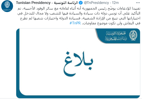 وتابع الرئيس التونسي، حسب الحساب الرسمي لرئاسة الجمهورية التونسية: "سيادة الدولة واختيارات شعبها لم تطرح في النقاش ولن تكون موضوع مفاوضات".