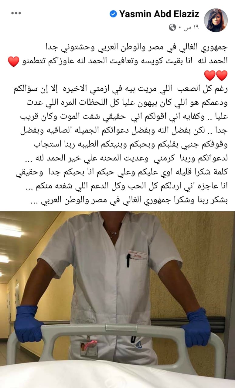 كانت الفنانة ياسمين عبد العزيز، شكرت جمهورها في رسالة كتبتها مساء أمس، عبر حسابها الشخصي بموقع التواصل الاجتماعي فيس بوك، جاء فيها: «جمهوري الغالي في مصر والوطن العربي، وحشتوني جدًا.. الحمد لله أنا بقيت كويسة وتعافيت الحمد لله، عوزاكم تطمنوا».
