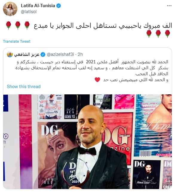 كتبت لطيفة في تغريدة عبر حسابها الرسمي بموقع التغريدات القصيرة تويتر تغريدة قالت فيها: «ألف مبروك يا حبيبي تستاهل أحلى الجوائز يا مبدع».