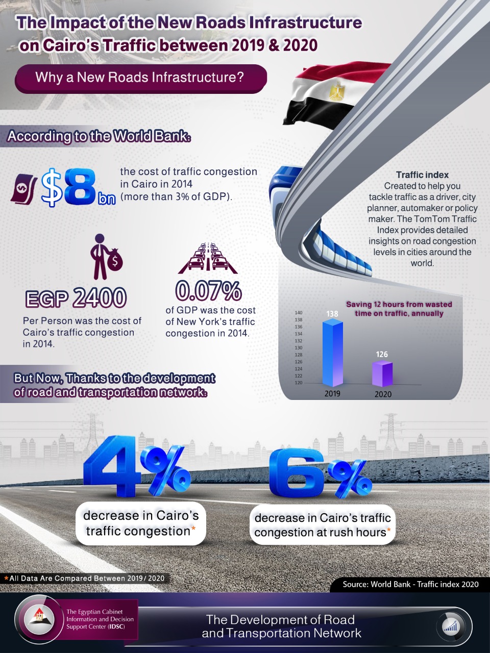 أصدر مركز المعلومات ودعم اتخاذ القرار بمجلس الوزراء المصري، انفوجراف يرصد فيه الأثر العملي الواضح لجهود الحكومة نحو تطوير شبكة الطرق والمواصلات، والتي بدأت تؤتي ثمارها، وفق مؤشر حركة المرور 2020 ومقارنة بياناته ببيانات البنك الدولي في 2014.
