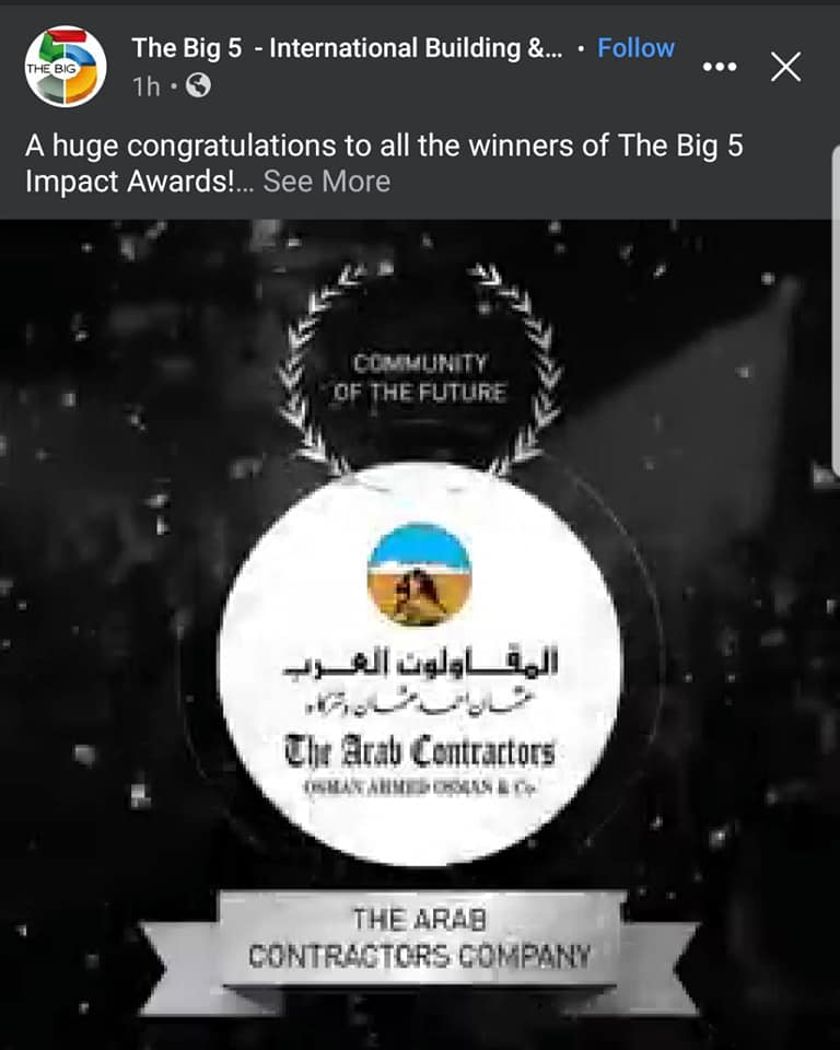 أعلنت مسابقة Big5 Impact Awards فى دبى بدولة الإمارات العربية المتحدة والتي تغطى منطقة الشرق الأوسط وإفريقيا وجنوب أسيا، فوز مشروع حياة كريمة بجائزة Community of the future بمعنى مجتمع المستقبل، ذلك المشروع الذى يأتي طبقا للمبادرة الرئاسية حياة كريمة والتي أطلقها الرئيس عبدالفتاح السيسي، لتطوير القرى المصرية، والذى تشارك به المقاولون العرب.