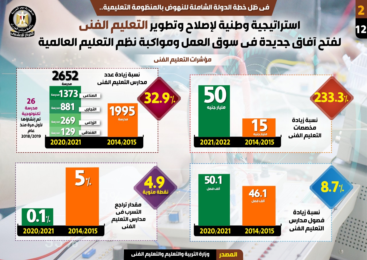 هذا وزاد عدد مدارس التعليم الفني بنسبة 32.9% عام 2020/ 2021، لتسجل 2652 مدرسة بواقع 1373 مدرسة صناعية و881 مدرسة تجارية و269 مدرسة زراعية و129 مدرسة فندقية، ولأول مرة تم إنشاء 26 مدرسة تكنولوجية منذ 2018/2019، فيما سجل عدد المدارس الفنية 1995 عام 2014/2015.