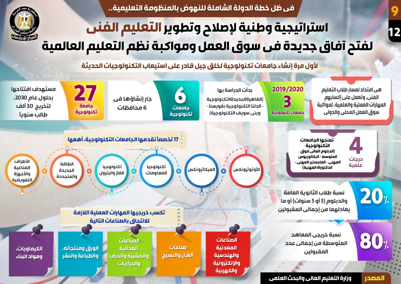أوضح التقرير أنه يتم إنشاء جامعات تكنولوجية لأول مرة لخلق جيل قادر على استيعاب التكنولوجيا الحديثة، وبمثابة امتداد لمسار طلاب التعليم الفني، لإكسابهم المهارات العملية والعلمية، لمواكبة سوق العمل المحلي والدولي.