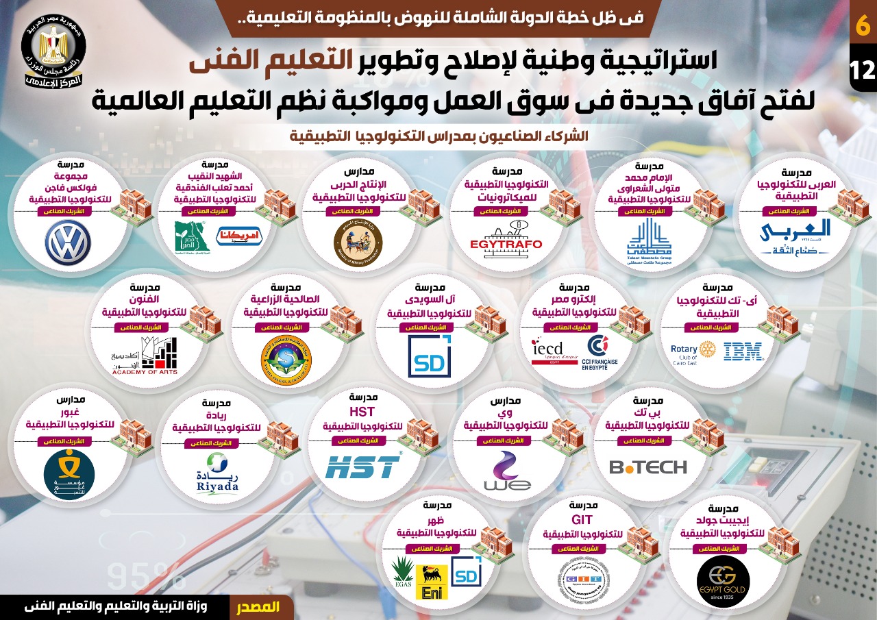 استكمل: من بين الشركاء وزارة الإنتاج الحربي بمدارس الإنتاج الحربي للتكنولوجيا التطبيقية، وشركة أمريكانا ومؤسسة مصر الخير بمدرسة الشهيد النقيب أحمد تعلب الفندقية للتكنولوجيا التطبيقية، وشركة IBM وروتاري بمدرسة أي- تك للتكنولوجيا التطبيقية، وغرفة التجارة الفرنسية والمعهد الأوروبي للتعاون والتنمية بمدرسة إلكترو مصر للتكنولوجيا التطبيقية.