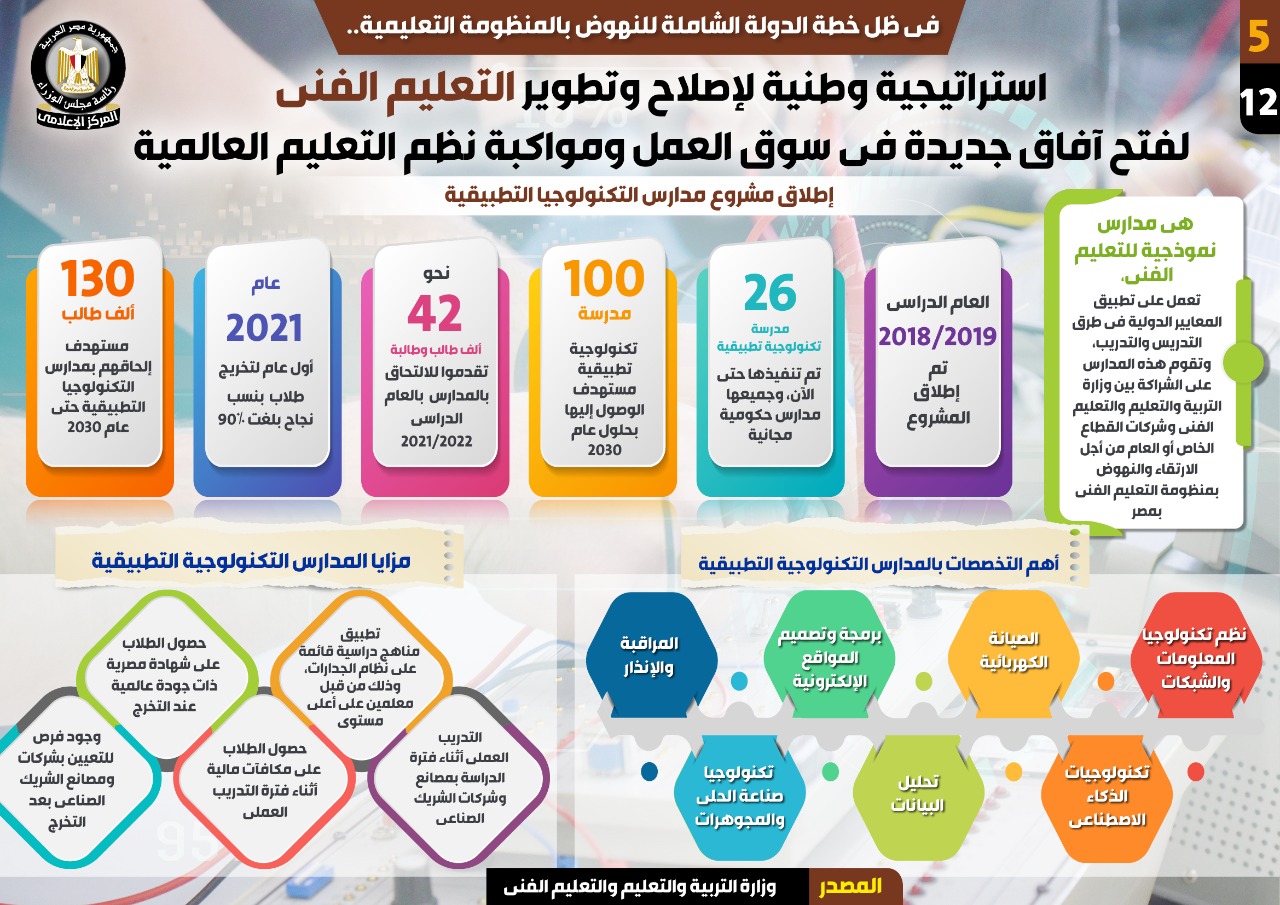 نشر المركز الإعلامي لمجلس الوزراء، تقريرًا تضمن إنفوجراف، سلّط الضوء على استراتيجية الدولة لإصلاح وتطوير التعليم الفني، لفتح آفاق جديدة في سوق العمل ومواكبة نظم التعليم العالمية، وذلك في ظل الخطة الشاملة للنهوض بالمنظومة التعليمية.