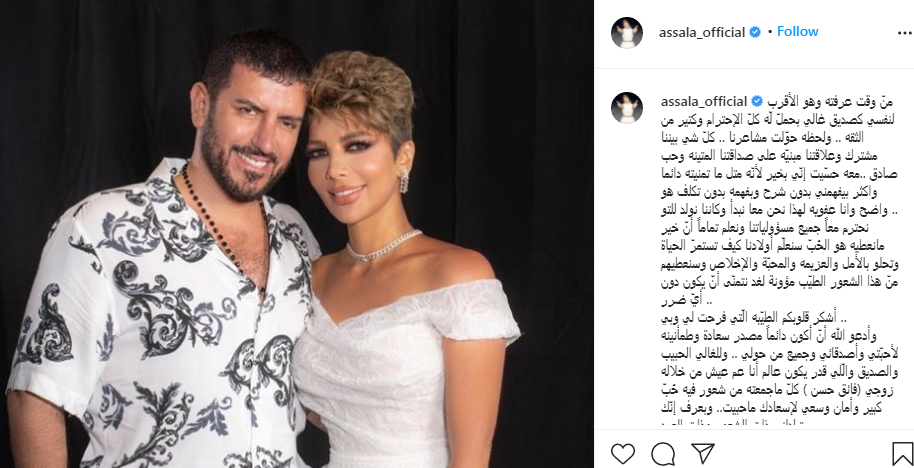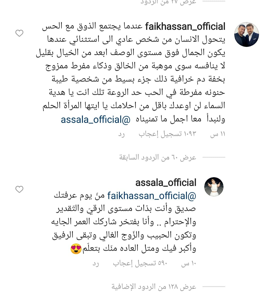 ورد الشاعر فائق حسن على كلام زوجته أصالة نصري، التي أعلنت من خلالها خبر زواجهما، وذلك عبر حسابها الشخصي، بموقع تبادل الصور والفيديوهات القصيرة انستجرام، قائلًا: عندما يجتمع الذوق مع الحس، يتحول الإنسان من شخص عادي إلى استثنائي.