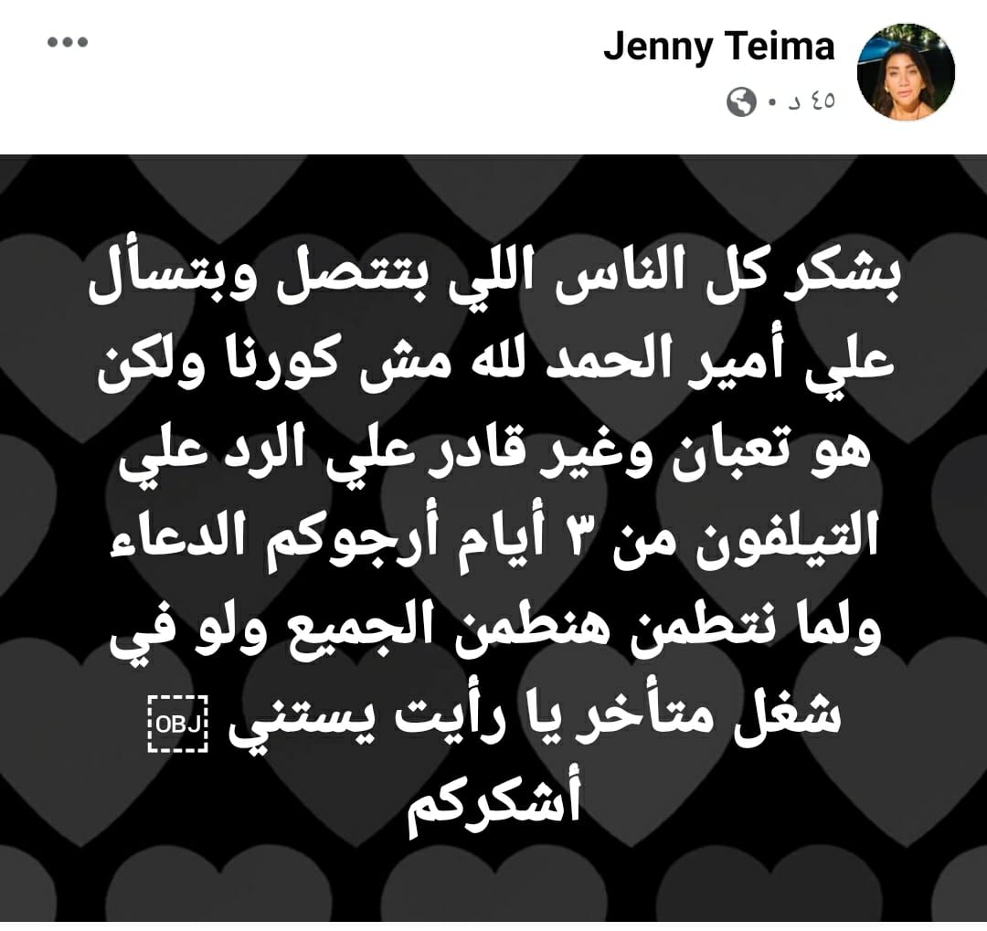 وكتبت زوجة أمير طعيمة منشورًا، عبر حسابها الشخصي بموقع التواصل الاجتماعي فيس بوك، قائلة: «بشكر كل الناس اللي بتتصل وتسأل على أمير، الحمد لله مش كورونا، ولكن هو تعبان وغير قادر على الرد على التلفون من 3 أيام.. ارجوكم الدعاء، ولما نطمن هنطمن الجميع، ولو في شغل متأخر ياريت يستنى، بشكركم».