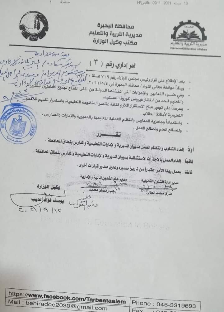 جاء القرار بعد الاطلاع على قرار رئيس مجلس الوزراء رقم 719 لسنة 2020، وبناء على موافقة اللواء هشام آمنة محافظ البحيرة في 4 مايو 2021، وفي ضوء التدابير والإجراءات التي اتخذتها الدولة من تلقى اللقاح لجميع العاملين بمديرية التربية والتعليم للحد من انتشار فيروس كورونا المستجد.