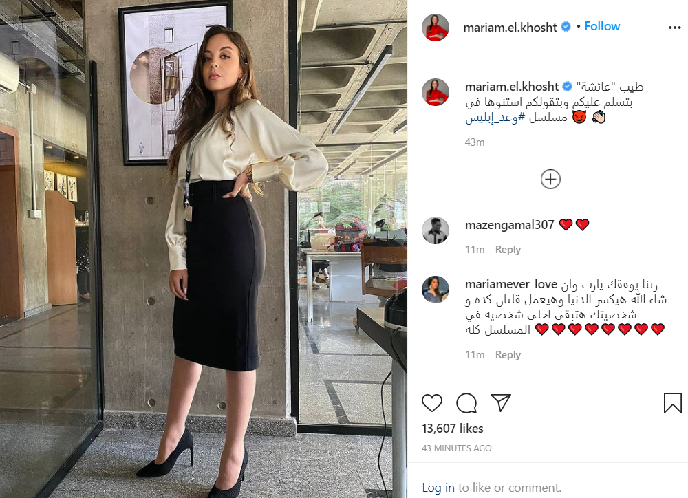 نشرت مريم الخشت صورة، عبر حسابها الخاص بموقع تبادل الصور والفيديوهات القصيرة انستجرام، وعلقت عليها قائلة: “طيب عائشة بتسلم عليكم وبتقول لكم استنوها في مسلسل وعد إبليس”.