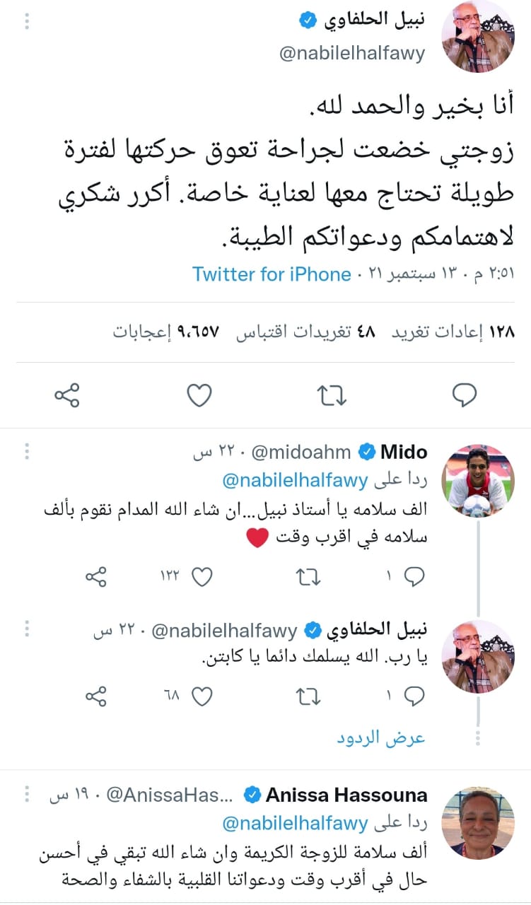 الحلفاوي كان قد كتب عبر حسابه الشخصي بموقع التواصل الاجتماعي تويتر: أنا بخير والحمد لله، زوجتي خضعت لعملية جراحية، تعوق حركتها لفترة طويلة، تحتاج معها لعناية خاصة، أكرر شكري لاهتمامكم ودعواتكم الطيبة.
