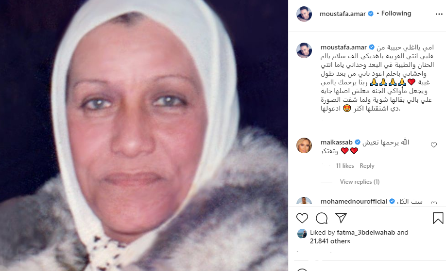 ونشر مصطفى قمر صورة والدته، عبر حسابه الشخصي بموقع تبادل الصور والفيديوهات القصيرة انستجرام، وعلق عليها قائلًا: أمي يا أغلى حبيبة من قلبي، أنتِ القريبة يا هديكي، ألف سلام يا أم الحنان والطيبة، في البعد وحداني ياما.
