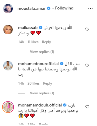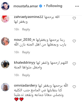 كما حرص عدد من زملاء الفنان مصطفى قمر على مواساته، والدعاء للراحلة بالرحمة والمغفر، ومن أبرز هؤلاء النجوم الفنانة مي كساب، التي كتبت تعليقًا جاء فيه: «الله يرحمها.. تعيش وتفتكر»، كما علق المطرب محمد نور على هذا المنشور قائلًا: «ست الكل الله يرحمها ويجمعنا بيها في الجنة يا رب»، كما علقت منى ممدوح قائلة: «يا رب يرحمها ويرحم أمي وكل أمواتنا».