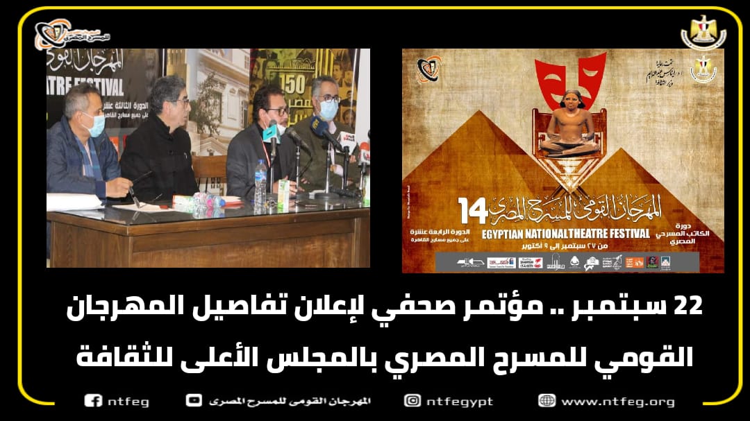 يعقد المهرجان القومي للمسرح المصري مؤتمرًا صحفيًا، يوم 22 سبتمبر الجاري؛ لإعلان تفاصيل الدورة الـ 14، وذلك بقاعة المؤتمرات بالمجلس الأعلى للثقافة، بحضور الفنان القدير يوسف إسماعيل رئيس المهرجان، والفنان القدير إسماعيل مختار مدير المهرجان ورئيس البيت الفني للمسرح، والفنان محمد رياض والناقد جرجس شكري، وأعضاء اللجنة العليا للمهرجان، وذلك برعاية وزيرة الثقافة الفنانة الدكتورة إيناس عبد الدايم.
