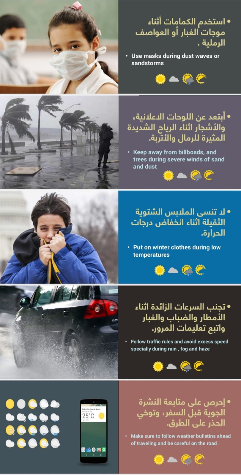 - الابتعاد عن اللوحات الإعلانية، والأشجار أثناء الرياح الشديدة المثيرة للرمال والأتربة