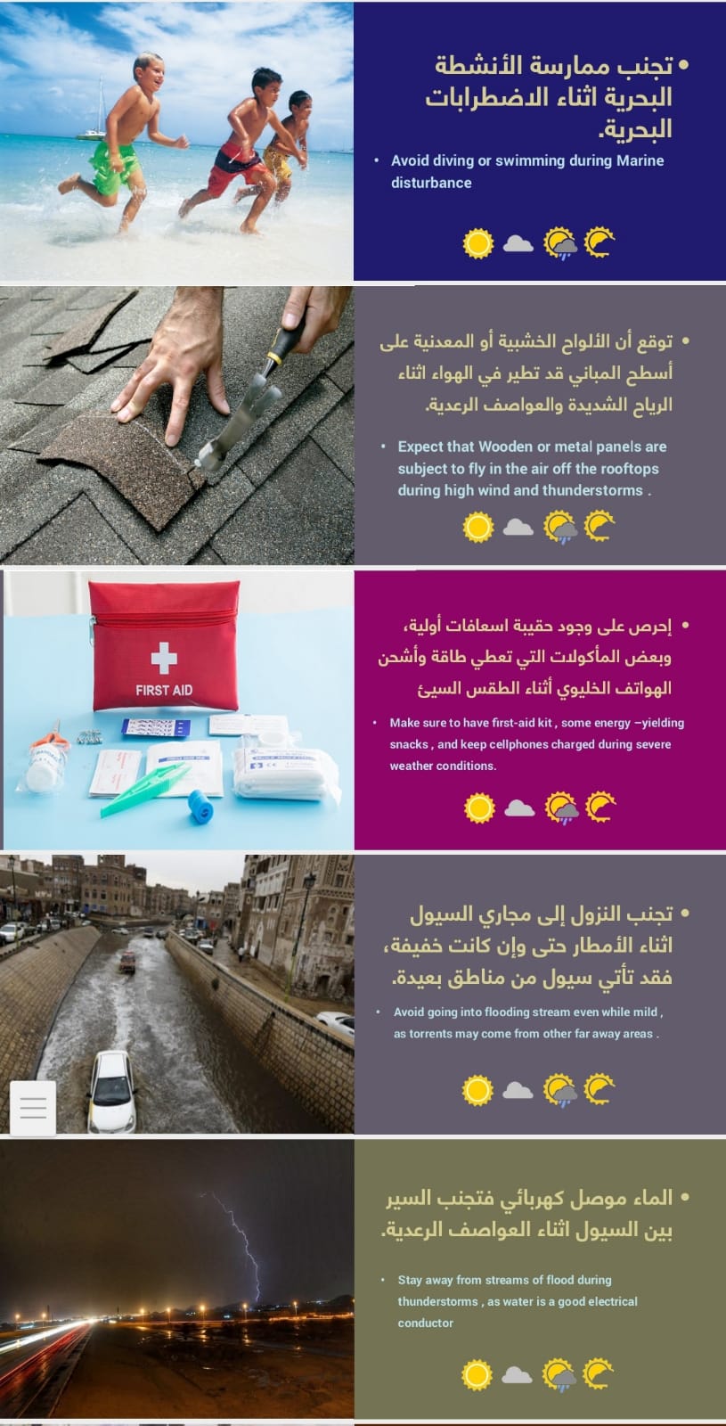 أعلنت اللجنة العربية للأرصاد عدة إجراءات يجيب اتباعها عند حدوث نوبات الطقس الجامحة وللوقاية من مخاطر الطقس، ومنها: