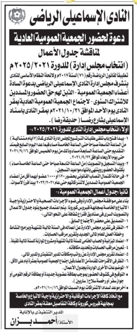 حدد مجلس إدارة الإسماعيلي، برئاسة المهندس إبراهيم عثمان، 31 أكتوبر المقبل موعدًا لانعقاد الجمعية العمومية، من أجل انتخاب مجلس إدارة جديد، يقود النادي للأربع سنوات المقبلة.