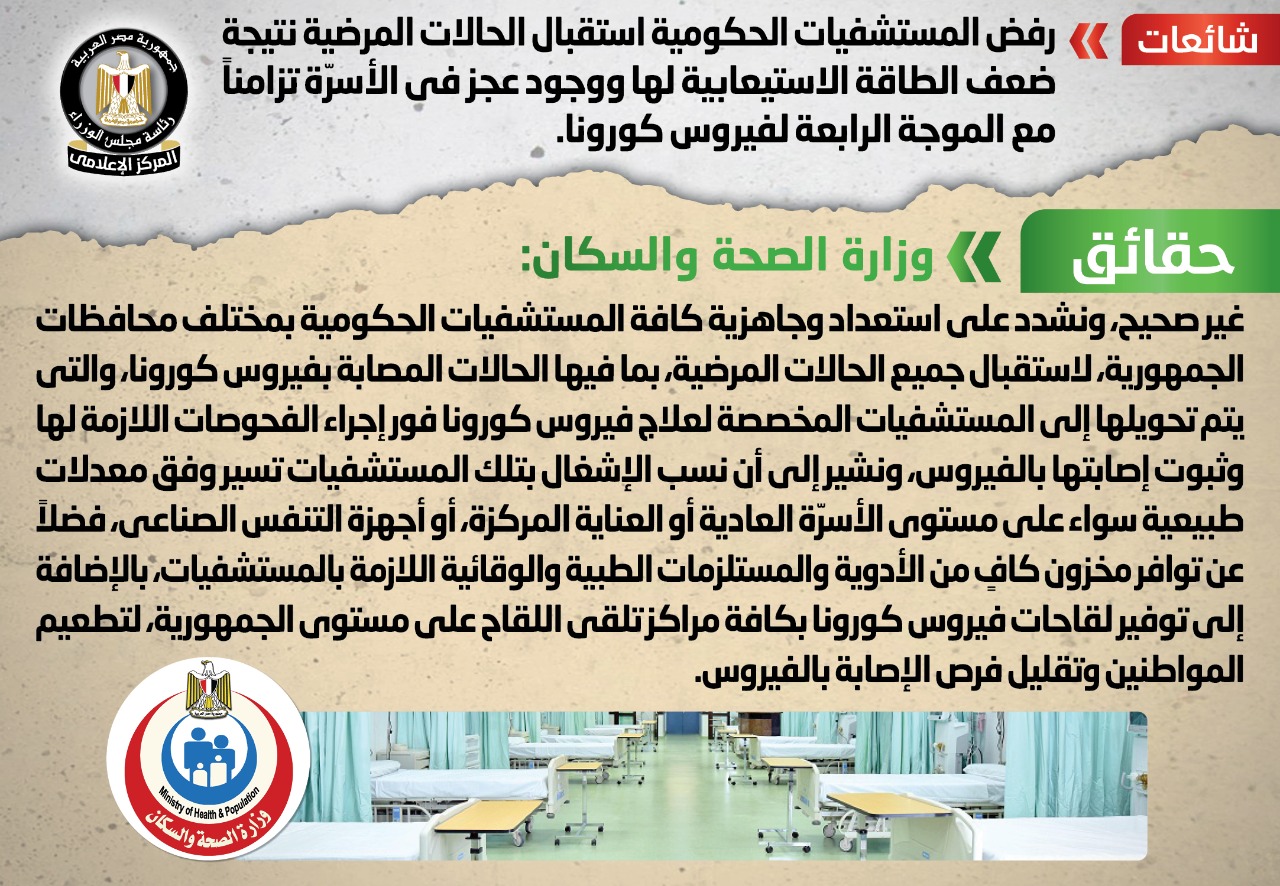 نفى المركز الإعلامي لمجلس الوزراء بالتواصل مع وزارة الصحة والسكان ما تداولته بعض المواقع الإلكترونية وصفحات التواصل الاجتماعي، أنباء بشأن رفض المستشفيات الحكومية استقبال الحالات المرضية نتيجة ضعف الطاقة الاستيعابية لها، ووجود عجز في الأسرّة تزامنًا مع الموجة الرابعة لفيروس كورونا.