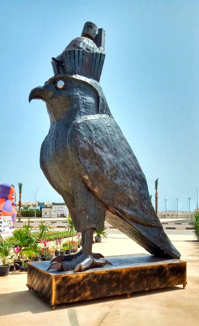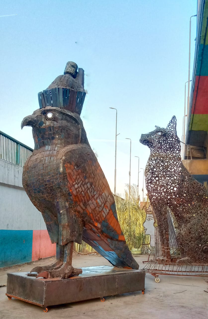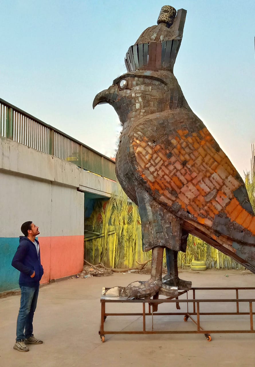 نص طن حديد خردة.. شاب يبدع في تصميم تمثال حورس بارتفاع 6 أمتار | صور