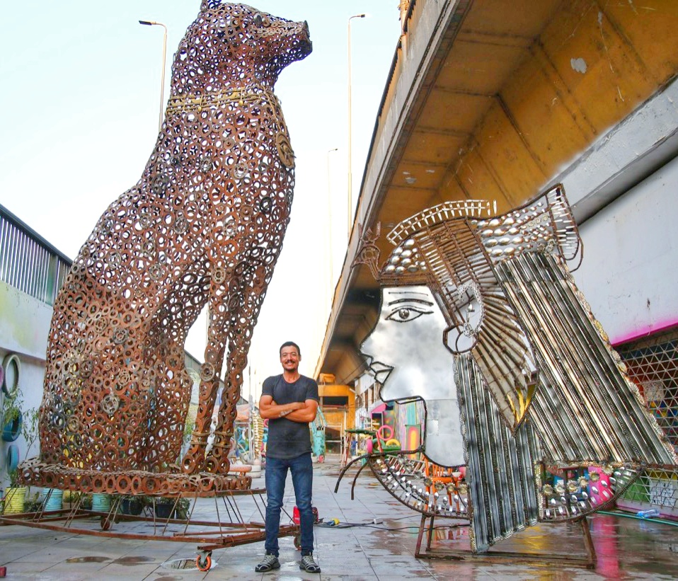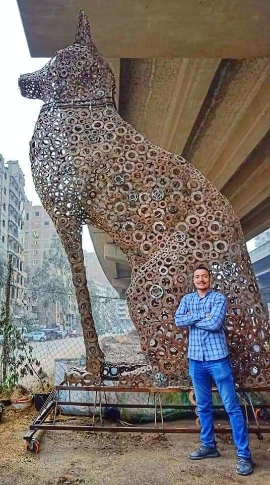 وواصل:« هنا ظهر لي فن الخردة الحديد، وأعجبتُ به للغاية، وبدأت البحث عن أعمال فنيه تتناسب معه، وبالفعل بدأت بأول عمل فني من الخردة، كان لقط المصريين القدماء باستيت وبلغ ارتفاعه 6 متر، ووزنه نص طن من الخردة الحديد، واستغرقته في تصميمه 30 يومًا».