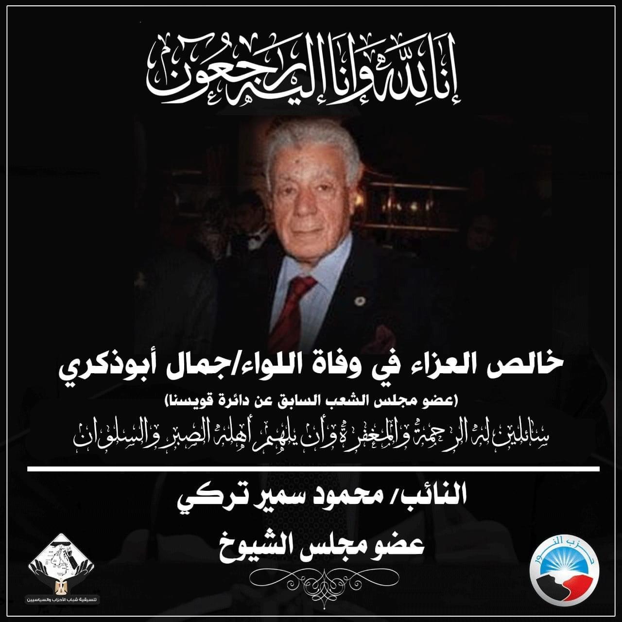 أعلن النائب محمود سمير تركي، عضو مجلس الشيوخ عن حزب النور، وتنسيقية شباب الأحزاب والسياسيين، وفاة اللواء جمال أبو ذكري، عضو مجلس الشعب السابق عن دائرة قويسنا.