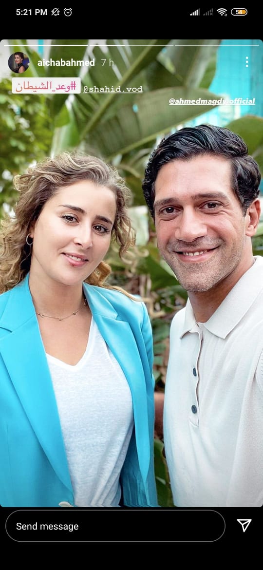 نشرت الفنانة التونسية عائشة بن أحمد صورة تجمعها بالفنان أحمد مجدي، من كواليس مسلسلها الجديد وعد الشيطان بطولة الفنان عمرو يوسف، المقرر عرضه على منصة شاهد الإلكترونية خلال الفترة المقبلة.