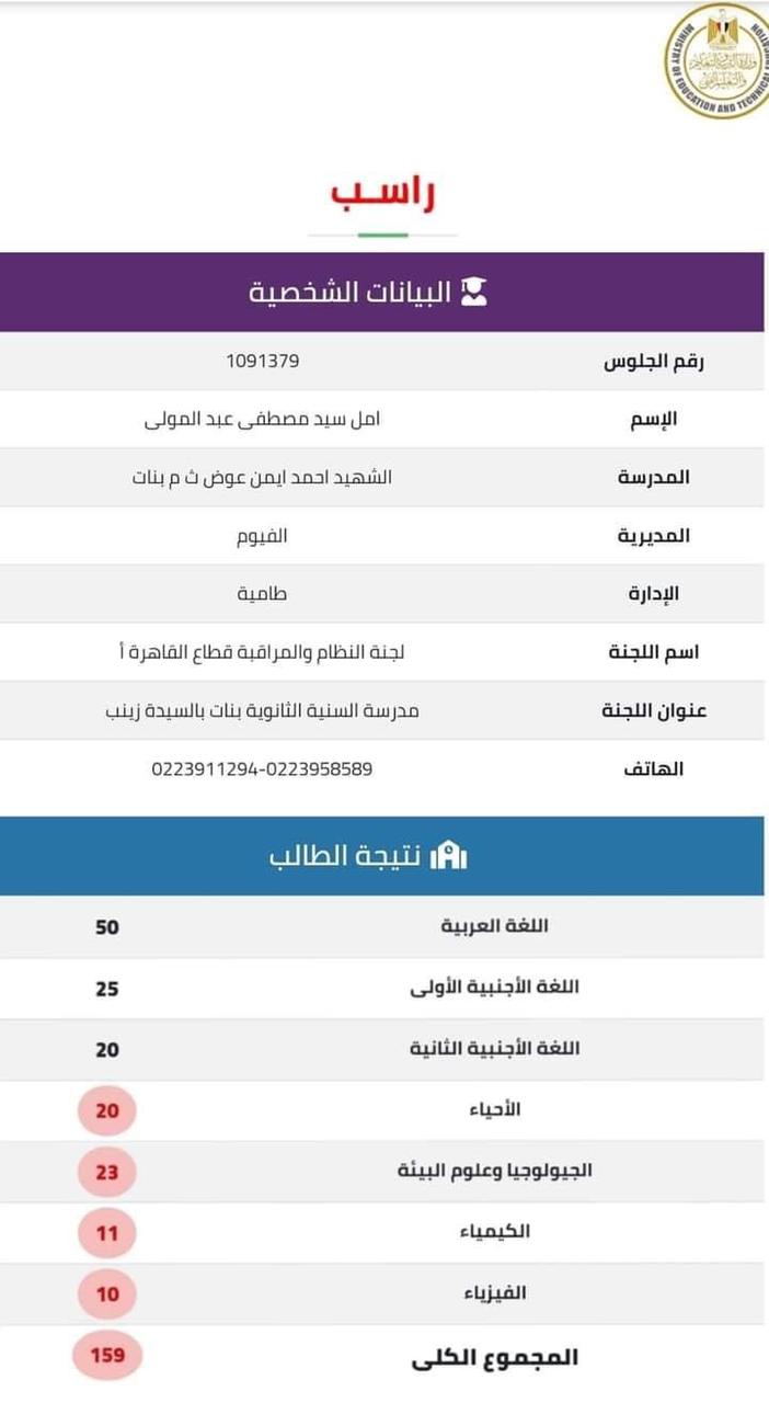 وأرسل حجازي لـ القاهرة 24، نتيجة الطالبة الفعلية قبل زيادة درجة ونصف في الأحياء من تظلم العام الماضي، مما يؤكد تزييف الطالبة للنتيجة المتداولة.