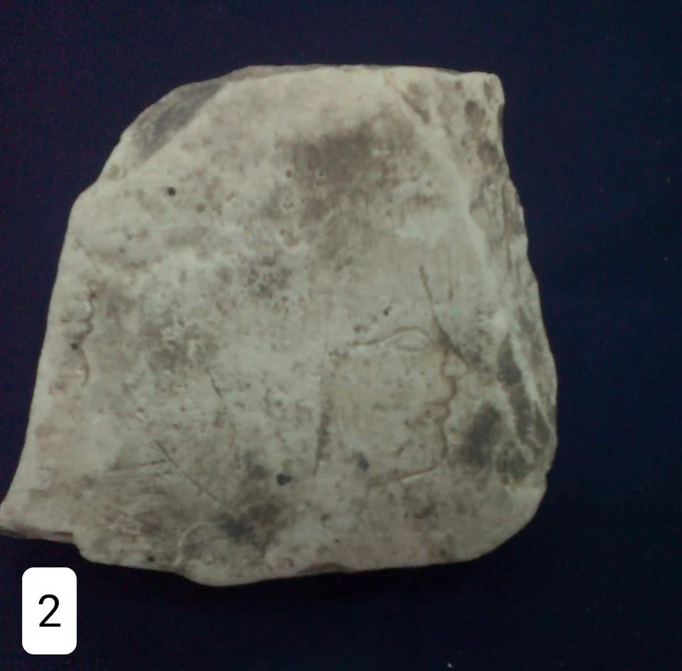 2- قطعة غير منتظمة الشكل يظهر منها نقش غائر يمثل وجه سيدة والقطعة ربما لوحة تعليمية، تم اكتشافها داخل حفائر الكباش.