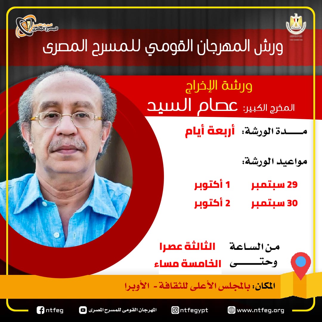 في إطار حرص المهرجان القومي للمسرح المصري، في دورته الرابعة عشرة برئاسة الفنان القدير يوسف إسماعيل، على إثراء فعاليات المهرجان بمجموعة كبيرة من الورش والندوات بجانب العروض المسرحية اليومية، يقدم المخرج الكبير عصام السيد ورشة في الإخراج المسرحي.