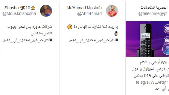أشار مصطفى شوشة على تويتر قائلا: « شركات عاوزه بس تمص جيوب الناس وخلاص #انترنت_غير_محدود_في_مصر»