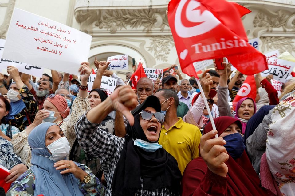 وخلال الساعات الماضية نظم عدد من المواطنين التونسيين وقفة احتجاجية أمام المسرح البلدي بالعاصمة التونسية، اعتراضًا على القارات الصادرة من الرئيس التونسي قيس سعيد، مطالبين بإعادة عمل مجلس النواب الذي يترأسه راشد الغنوشي، زعيم حركة النهضة الإخوانية.
