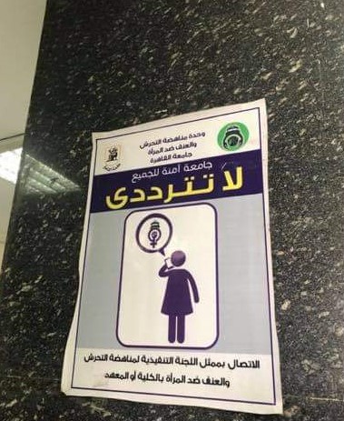 وأضاف المصدر أنه قد تم إنشاء لافتة جامعة آمنة للجميع، والتي لاقت إعجاب العديد من مستخدمي التواصل الاجتماعي، بعد تداول صورة تظهر إعلان لمركز مناهضة العنف ضد المرأة، لحث جميع طالبت وأعضاء هيئة التدريس والموظفات على سرعة الاتصال بممثل اللجنة التنفيذية لمناهضة التحرش والعنف ضد المرأة وضرورة الإبلاغ عن المتحرش، وذلك في إطار جهود الوحدة لمناهضة التحرش.