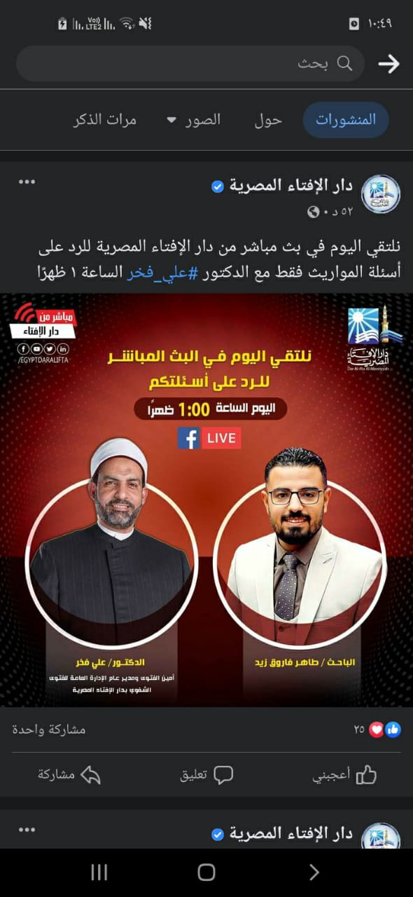 نشرت الإفتاء، عبر صفحتها الرسمية، بموقع التواصل الاجتماعي فيسبوك، قائلة: إن الباحث طاهر فاروق زيد، سيلتقي مع الدكتور علي فخر، أمين الفتوى وأمين عام الإدارة العامة للفتوى الشفوي بدار الإفتاء المصرية، وذلك عبر خاصية البث المباشر، للرد على مسائل المواريث، في تمام الساعة الواحدة ظهرًا.