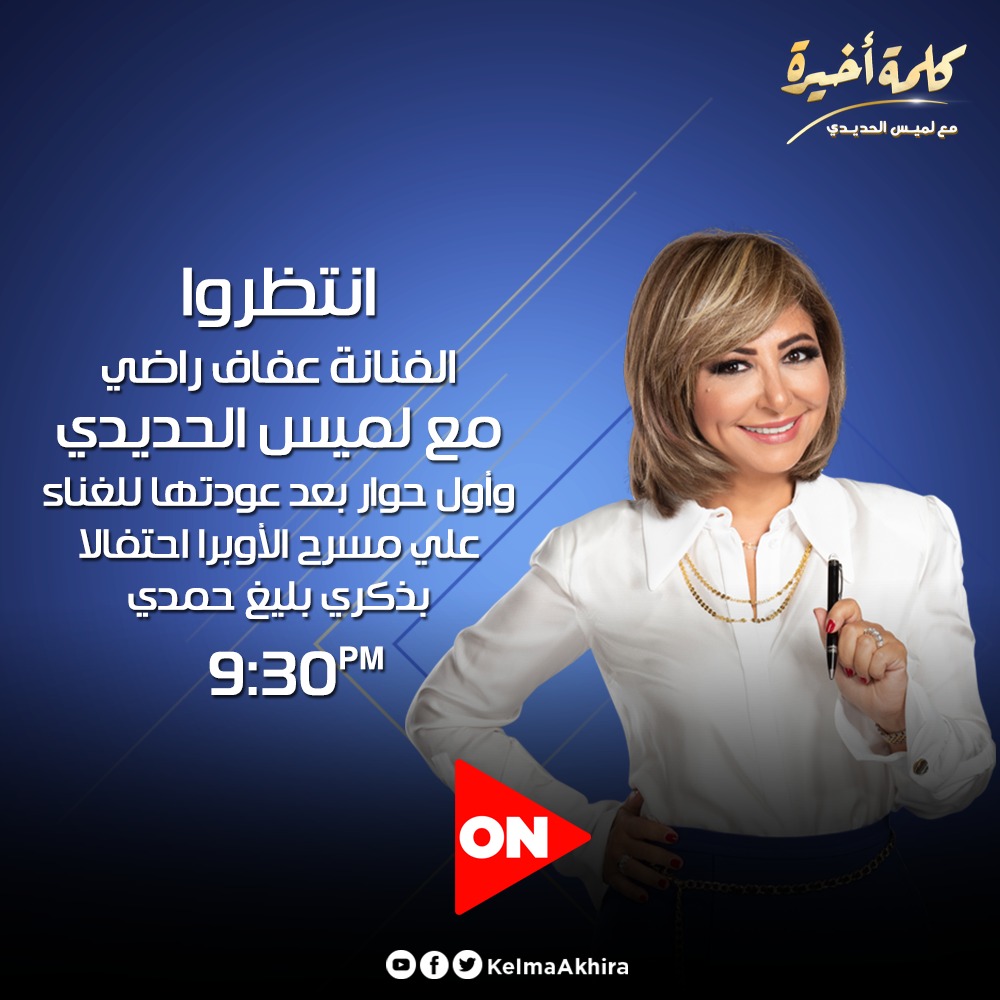 تحل الفنانة عفاف راضي، ضيفة على برنامج كلمة أخيرة، الذي تقدمه الإعلامية لميس الحديدي، وذلك اليوم الأحد في تمام الساعة التاسعة ونصف مساءً على شاشة ON.