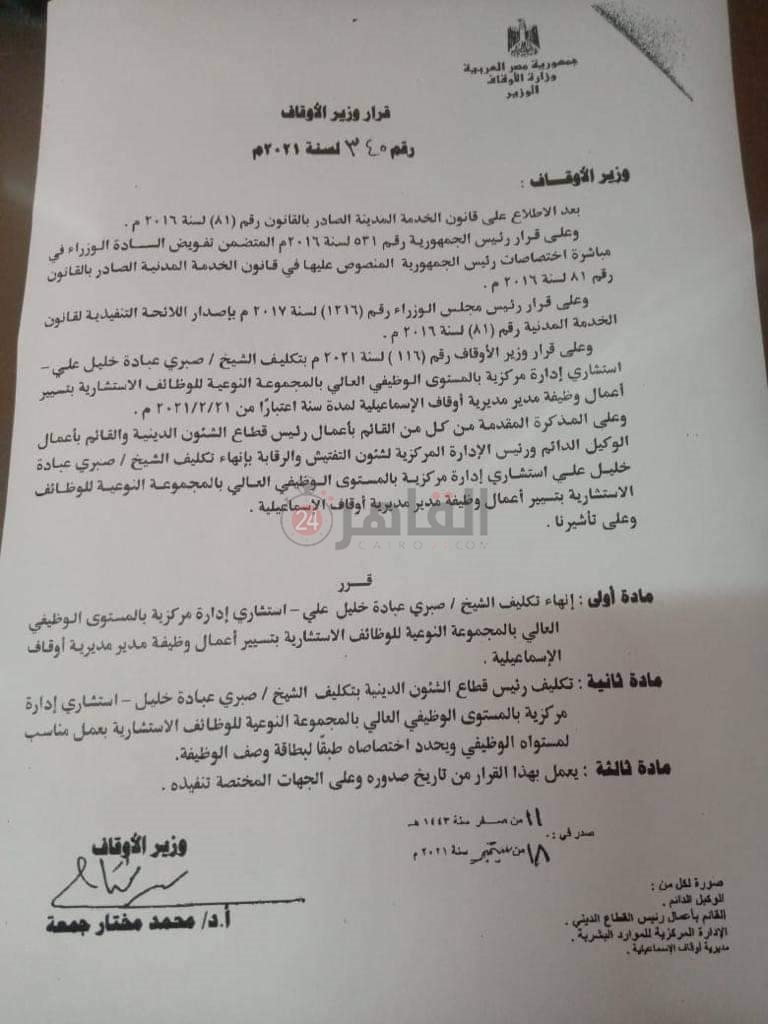 كما نص القرار أيضًا على إنهاء تكليف الشيخ صبري عبادة، استشاري إدارة مركزية بالمستوى الوظيفي العالي بالمجموعة النوعية للوظائف الاستشارية، بتسيير أعمال وظيفة مدير مدرية أوقاف الإسماعيلية.