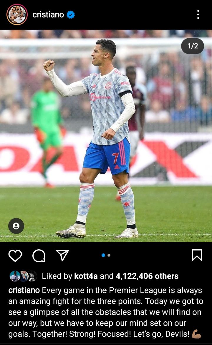 وكتب كريستيانو رونالدو عبر صفحته الرسمية بـ انستجرام: كل مباراة في البريميرليج هي دائمًا معركة رائعة على النقاط الثلاث، اليوم حصلنا على لمحة عن جميع العقبات التي سنجدها في طريقنا، ولكن علينا أن نبقي أذهاننا مركزة على أهدافنا، معًا بقوة وتركيز، هيّا بنا أيها الشياطين.