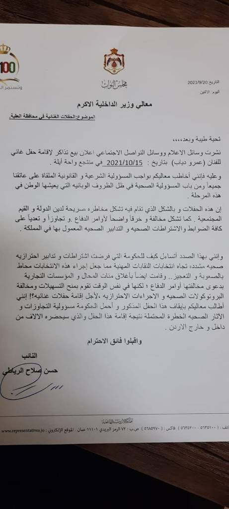 وجاء في الطلب البرلماني، الذي تقدم به النائب الأردني حسن صلاح الرياطي، أن الشكل الذي تقام به هذه الحفلات الغنائية، تشكل مخاطرة صريحة لدين الدولة والقيم المجتمعية، كما تشكل مخالفة وخرقًا واضحًا لأوامر الدفاع وتجاوزًا لجميع الضوابط والاشتراطات الصحية المعمول بها في المملكة.