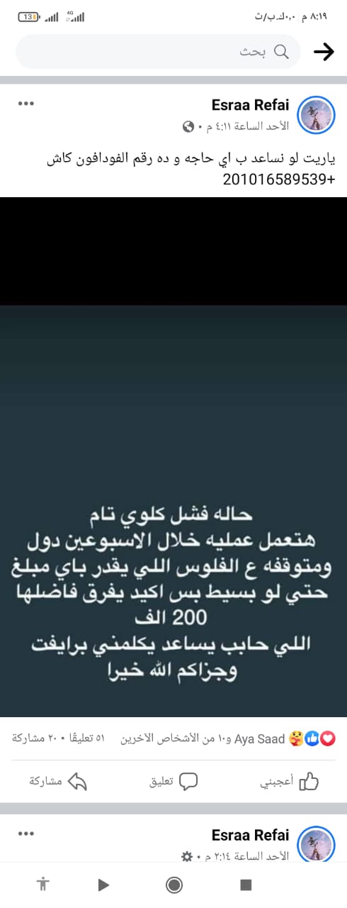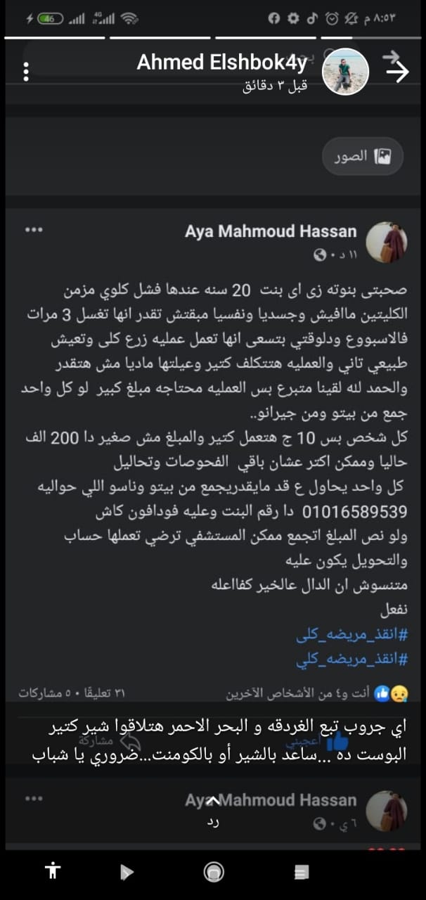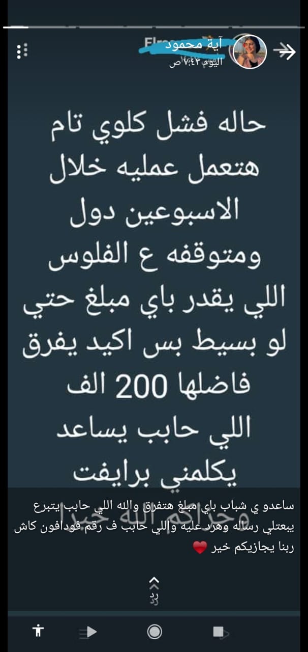 مشيرا إلى تدشين هاشتاج على مواقع التواصل الاجتماعي، وتمكنهم من جمع ما يقرب من 8000 من أصدقائنا والمبلغ المتبقي كبير، وحالتها الصحية لا تسمح بالانتظار طويلًا.