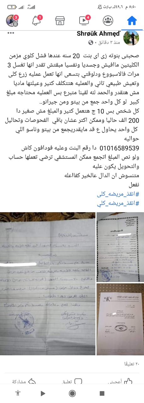تضيف ياسمين أحمد، مصاريف العملية تصل إلى ما يقرب من 300 ألف جنيه وهى من أسرة متوسطة الحال كمعظم الأسر المصرية، ولن تستطيع تدبير مصاريف العملية والمقررة خلال نهاية الشهر الجاري.
