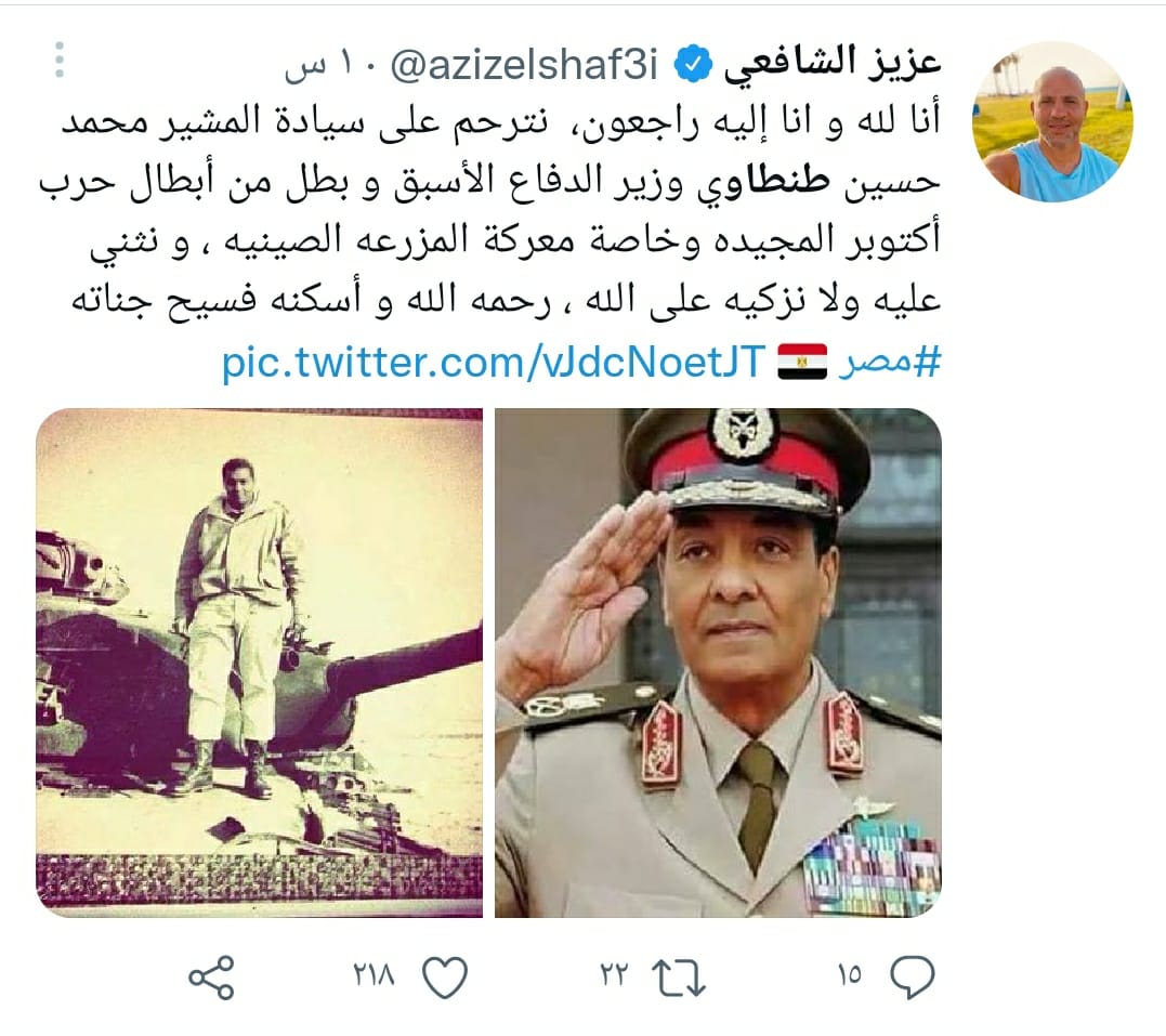نعى الملحن الغنائي عزيز الشافعي، المشير طنطاوي عبر حسابه الشخصي بموقع التدوينات تويتر، قائلًا: إنا لله وإنا إليه راجعون، نترحم على سيادة المشير محمد حسين طنطاوي وزير الدفاع الأسبق، وبطل من أبطال حرب أكتوبر المجيدة، وخاصة معركة المزرعة الصينية، ونثني عليه ولا نزكيه على الله، رحمه الله وأسكنه فسيح جناته.