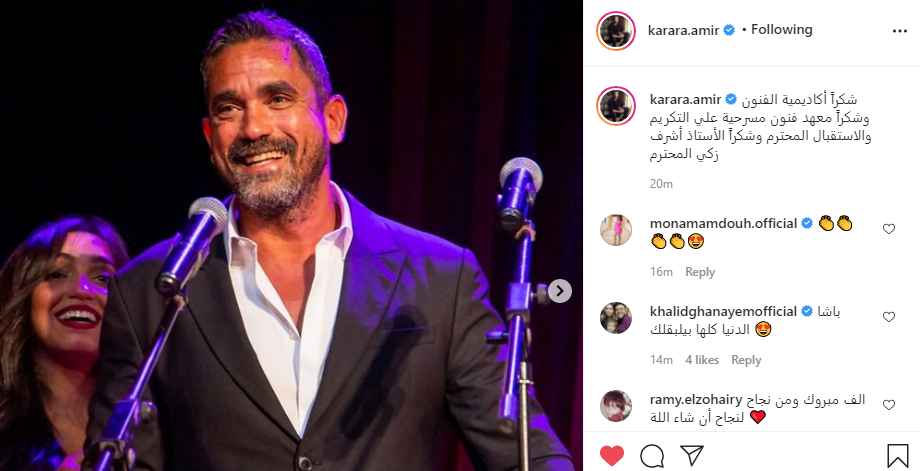 علق الفنان أمير كرارة، على تكريمه في مهرجان المسرح العربي، موجهًا الشكر لكل القائمين على فعاليات مهرجان المسرح العربي في دورته الـ38، الذي أقيم مساء أمس الإثنين.