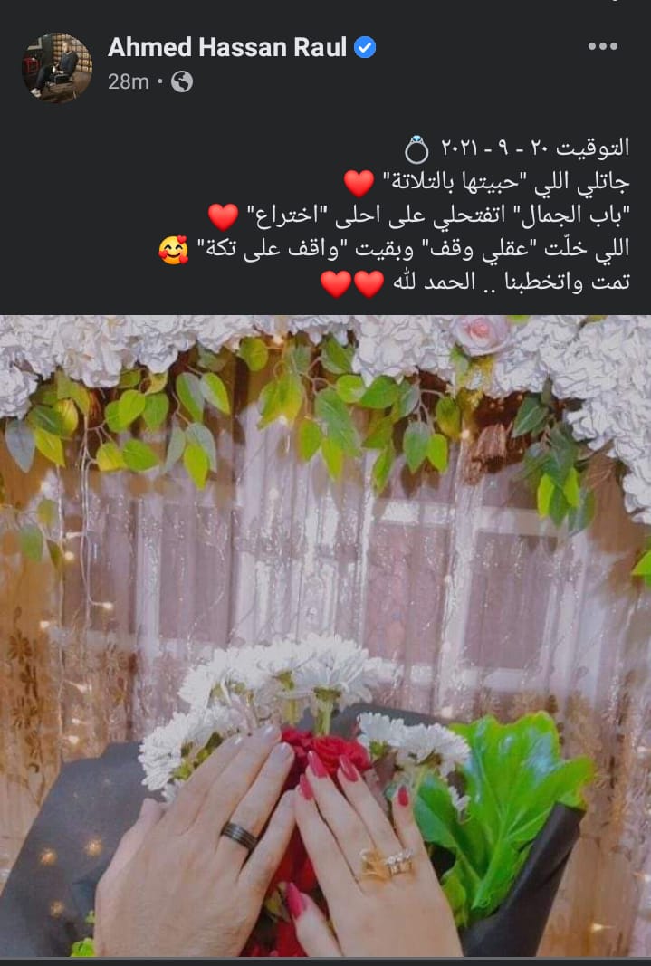نشر أحمد حسن راؤول صورة يديه برفقة عروسه مرتديين خاتم الخطوبة، عبر صفحته الشخصية على موقع فيس بوك، مُعبرًا عن حبه الشديد لها قائلًا: التوقيت 20-9-2021.. جاتلي اللي حبيتها بالتلاتة.. باب الجمال اتفتح لي على أحلى اختراع.. اللي خلّت عقلي وقف، وبقيت واقف على تكة.. تمت واتخطبنا.. الحمد لله.