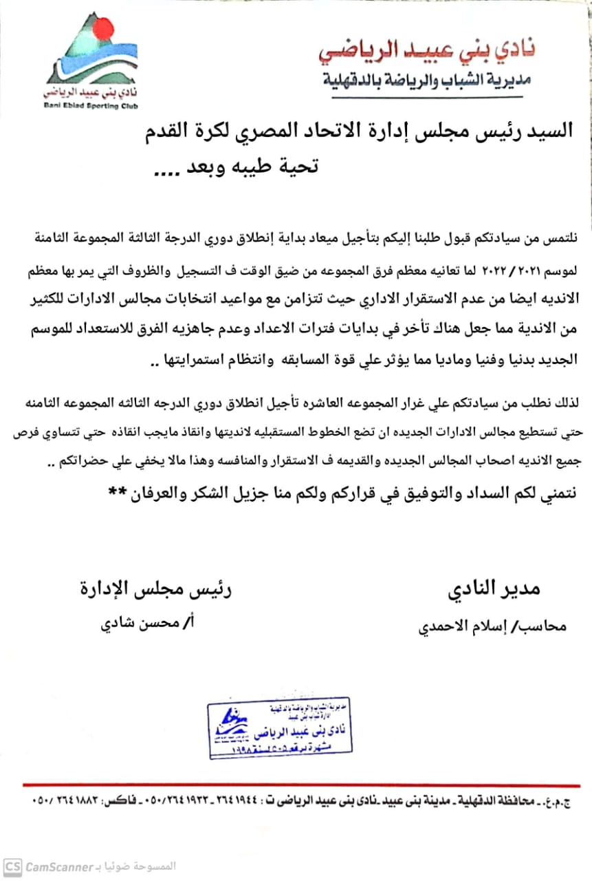 أرسل مجلس إدارة نادي بني عبيد برئاسة محسن شادي، خطابًا رسميًا إلى الاتحاد المصري لكرة القدم، يطلب فيه تأجيل موعد انطلاق دوري الدرجة الثالثة لمجموعة الثامنة ومقرها الدقهلية.